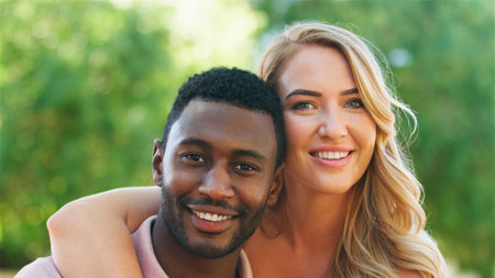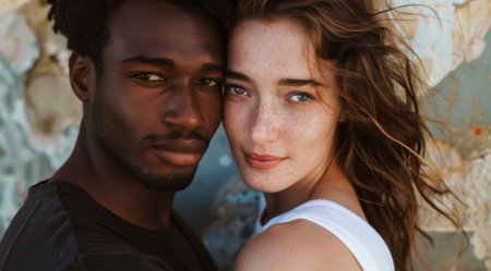 Portrait of a man and a woman hugging each other. Diverse interracial relationship, young couple