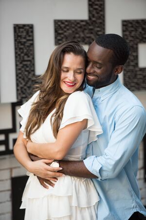 Young interracial couple hugging. Millennial lovers, african and white couple