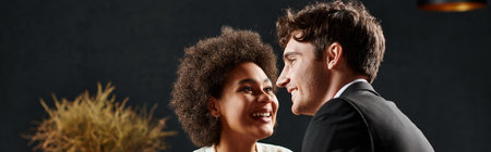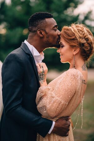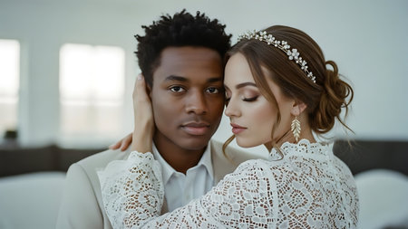 Portrait of beautiful young woman and handsome African American man in wedding dress