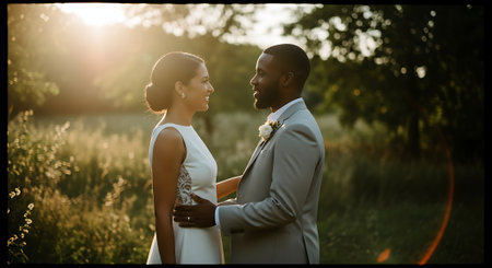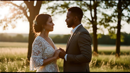 A romantic couple, a black man in a gray suit and a white woman in a elegant dress, stand facing each other in a lush green field with trees and wildflowers at sunset.
