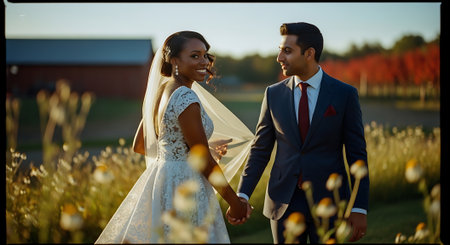 A smiling multi-ethnic couple, dressed in wedding finery, walk hand in hand through a lush green outdoor setting, surrounded by trees and warm sunlight.