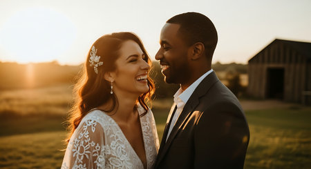 A smiling interracial couple in wedding attire standing close together outdoors during sunset, with a barn in the background.