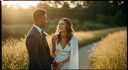 A smiling African American man in a suit and a Caucasian woman in a white dress hold hands, standing on a path in a field of tall grass, with the sun setting behind them.