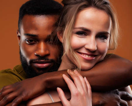 Young pretty couple diverse races together posing sensitive on brown background, lifestyle people concept