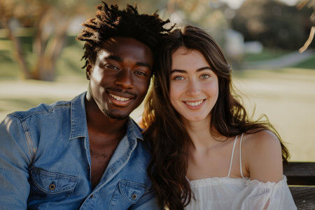 Happy interracial couple on a bench in the park.