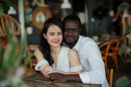 A man and a woman of different ethnicities sitting together at a table in a cafe.