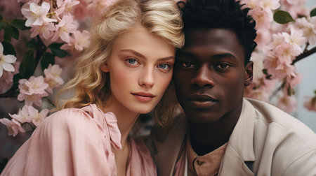 Romantic multiracial couple embracing in garden surrounded by blossoms.