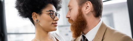 young african american woman seducing and looking at businessman, banner