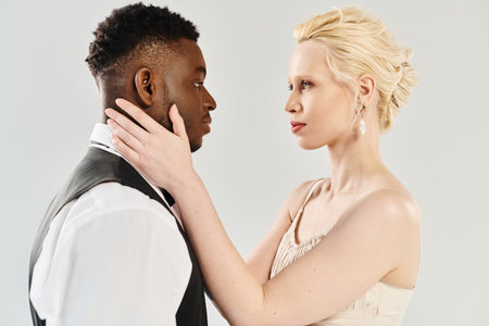 A beautiful blonde bride in a wedding dress and African American groom standing together in a studio on a grey background.
