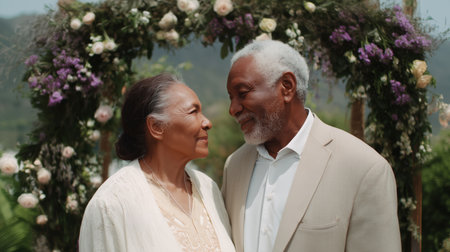 Elderly couple celebrating their black wedding anniversary surrounded by flowers Generative AI