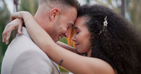 Close up portrait of a happy mixed race bride and groom embracing in the park
