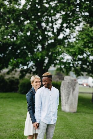 Interracial couple stands and holds hands in park on background of statue Polovtsian woman. Concept of love relationships and unity between different human races.