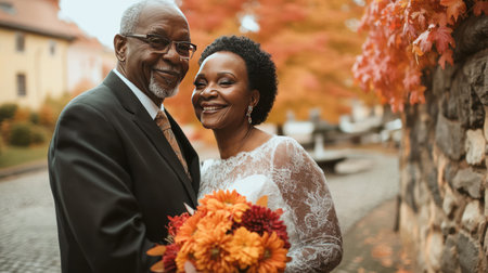 Autumn or fall wedding day photo of an elderly black couple. A portrait of senior bride and groom in festive clothing with flowers. People in love are outdoors in autumn landscape, AI generated