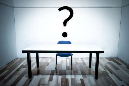 Manager is worried about future and decision making concept. Question mark symbolizing decision making and manager or businessperson hiding behind his hand and the table.