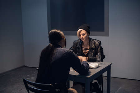A pretty blonde is interrogated by a female investigator about a package of white powder found in her possession.