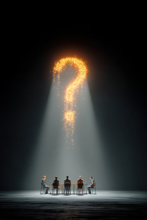 A quiet person in meeting asks simple question, illuminated by glowing question mark above