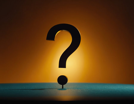 A single question mark on the ground, casting a shadow, conveys a sense of mystery and the unknown