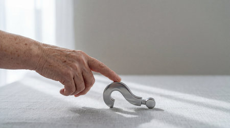 Elderly hand gently touching a metal question mark shaped object on a light fabric surface in a bright minimalist interior.