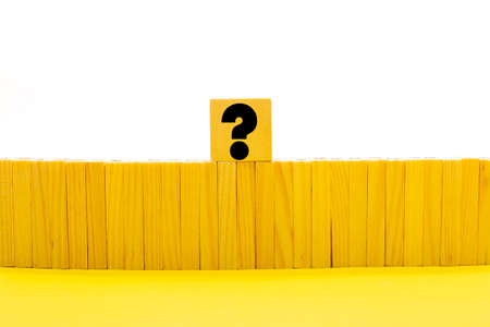 wooden blocks with a wooden cube with question mark above. Business strategy, problem solving, challenge and obstacle concept.