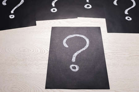 Memo piece of paper with drawn question marks on colored background. Top view. Minimalism