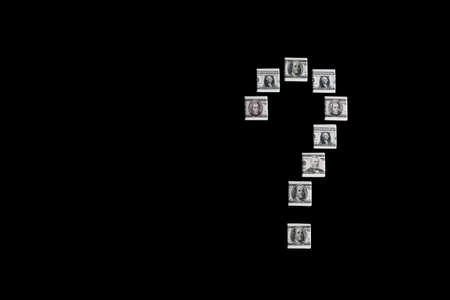 Question sign from portraits of dollar banknotes, isolated on black background with copy space