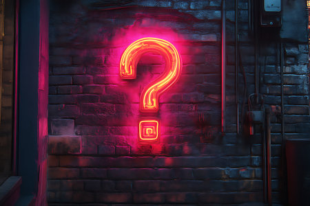A vibrant neon question mark sign illuminated against a rustic brick wall, creating a striking contrast between modern and vintage elements. Perfect for modern decor, signage, and conceptual photography.