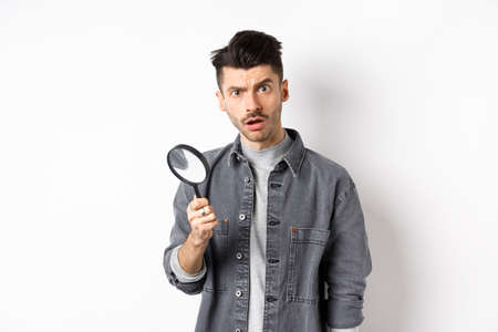 Shocked man found something with magnifying glass, look at camera, standing against white background