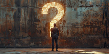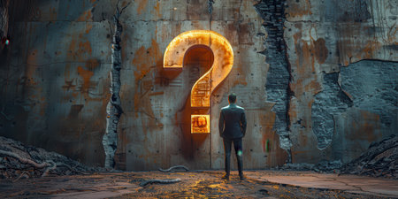A businessman stands in front of a large, illuminated question mark on a dilapidated concrete wall, symbolizing uncertainty and decision-making.