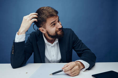 Business man thinking, business man holding glasses, business man in office on blue background.
