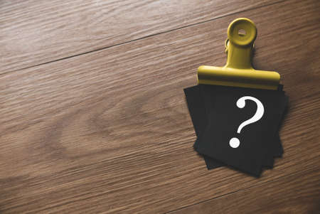 A stack of black paper written with Question mark symbol on wooden background with copy space.