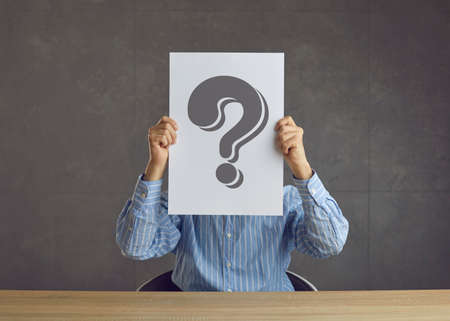 Unrecognizable business person holding paper sheet with question mark and asking questionnaire or quiz question. Faceless unknown entrepreneur sitting at desk hiding face behind question mark placard