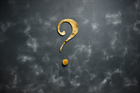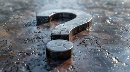 A close-up shot of a metallic question mark placed on a wet, reflective surface, symbolizing curiosity and mystery.