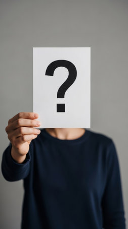 Woman holding question mark paper in front of her face. Concept of prosopagnosia, identity crisis, unknown person, mystery, or unanswerable questions.