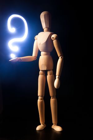Wooden doll with a question on a hand