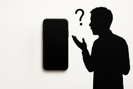 Silhouette of a person and a question mark next to a smartphone. Space for text