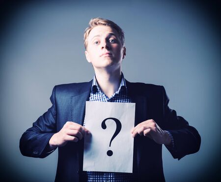 Young businessman holding a white billboard with a question mark on it