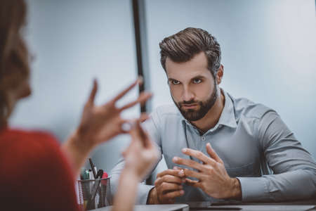 Young listening psychologist with a patient in the office. A young professional psychotherapist conducts an interview with a patient in the office