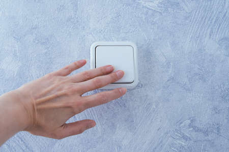 Light switch button on the blue cement wall. Energy use in home. Electricity consumption.