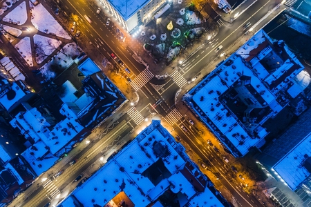 Aerial drone view on city intersection during winter night in Gliwice, Silesia, Poland