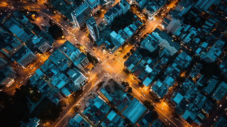 Stunning aerial view of a bustling city intersection at night, showcasing vibrant lights, busy streets, and dynamic urban life from above.