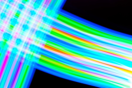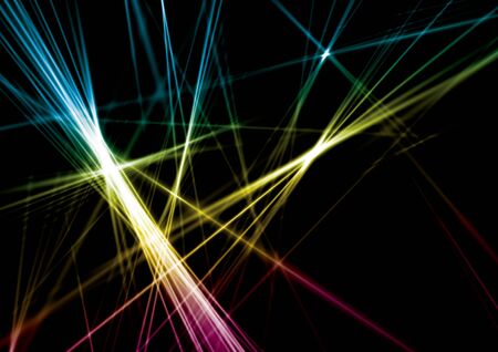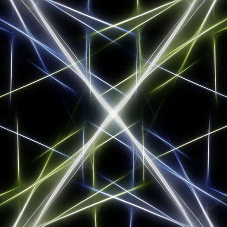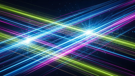 Abstract digital art featuring intersecting neon light streaks of blue, green, and magenta against a dark background.