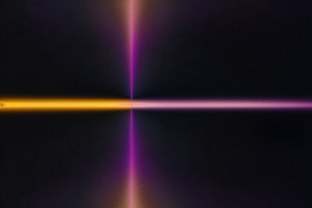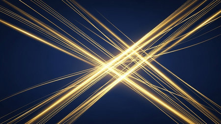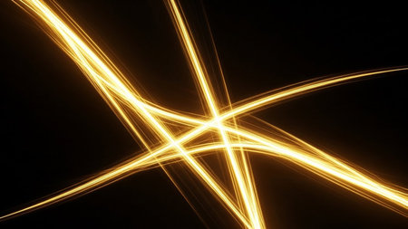 Abstract golden light streaks intersect and glow against a dark black background. Clear details and vibrant co...