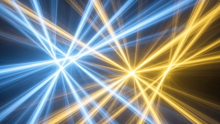 This image captures a mesmerizing burst of light that radiates from the center, creating a stunning display of blue and gold streaks. The vibrant lines spread out in all directions, evoking a sense of energy and movement. The contrast between the dark background and the bright, colorful lines adds to the visual impact, making it appear as if the light is exploding or spreading outwards in a cosmic dance.