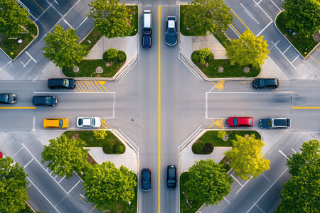 Aerial view of a busy intersection showcasing the flow of traffic and vehicles. The image captures urban life, highlighting pathways and landscaping.