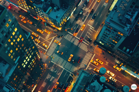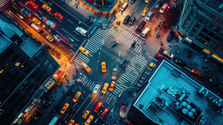Overhead shot of a bustling city crosswalk with yellow taxis and pedestrians, capturing the vibrant urban life during rush hour. Resplendent.