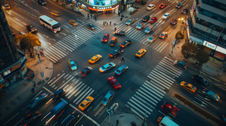 An intersection with cars moving in different directions, traffic lights, and pedestrian crossings, showing the organized chaos of city traffic.