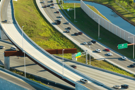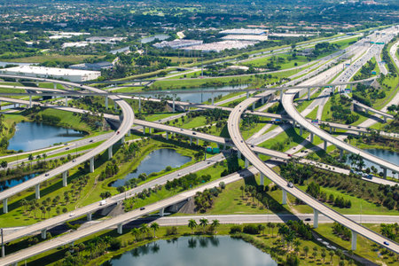 View from above of american big freeway intersection in Miami, Florida with slow driving cars during rush hour. USA transportation infrastructure concept