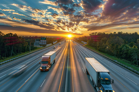 Trucks traversing highway against vibrant sunset, capturing the essence of transportation
