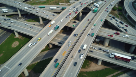 An aerial view captures a bustling highway interchange filled with a variety of vehicles, showcasing the vibrant flow of city life. The intricate network of roads, lined with cars and trucks, highlights the complexity and energy of urban transportation.