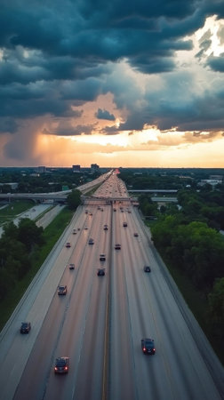 Vehicles traverse a busy highway as dark clouds loom above, while a vibrant sunset casts an enchanting glow over the distant skyline. The atmosphere hints at an impending storm.